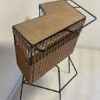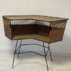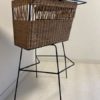 Bar en rotin des années 1960 très original avec son piétement en fer forgé noir et son revêtement plastique sur le dessus. Quelques petits manques de rotin (voir photos).