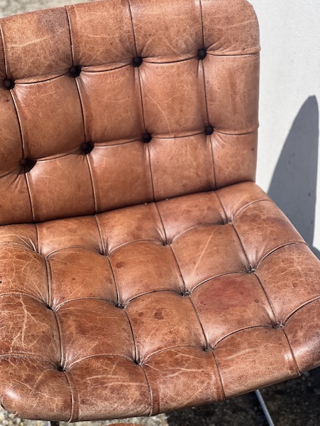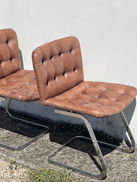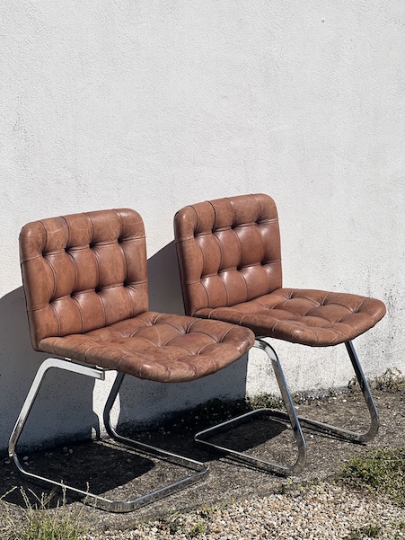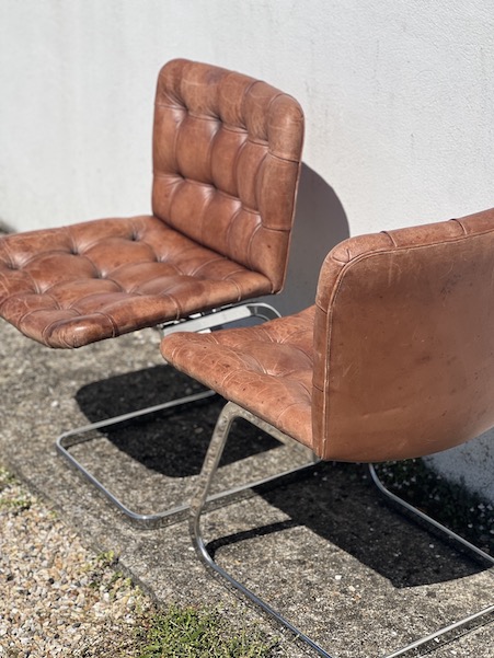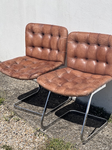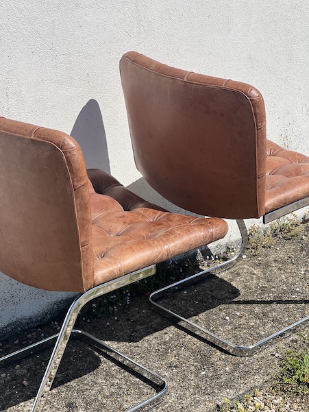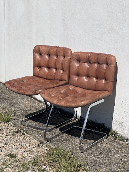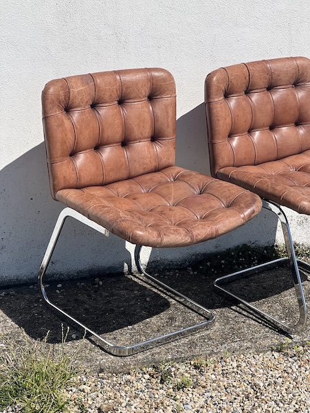 Superbe paire de chaises design, par Robert Haussman, fabriquées en suisse par De Sede dans les années 60. Cuir marron avec boutons, et acier chromé pour le piètement. En super état! Voir les photos.